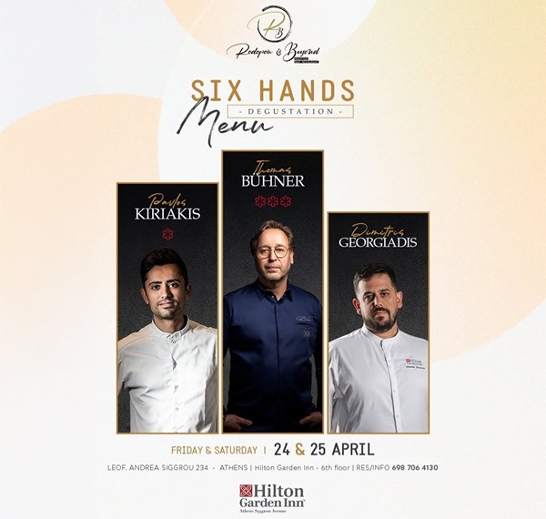 Στις 24 και 25 Απριλίου, το εστιατόριο Rodopou & Beyond Athens παρουσιάζει ένα ξεχωριστό γαστρονομικό γεγονός υψηλής αισθητικής, ανεβάζοντας τον πήχη της fine dining εμπειρίας στην πρωτεύουσα. Το εντυπωσιακό 6 Hands Degustation Menu θα φιλοξενηθεί στο rooftop του Hilton Garden Inn Athens, στον 6ο όροφο, προσφέροντας πανοραμική θέα στην πόλη και μια βραδιά αφιερωμένη στη σύγχρονη δημιουργική κουζίνα.