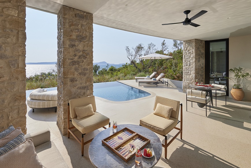 Η ομάδα των αρχιτεκτόνων, Tombazis & Associates Architects και K-Studio έχει συνδυάσει τη δημιουργικότητα και τη δεξιοτεχνία, διασφαλίζοντας ότι κάθε πτυχή του αποτυπώνει στο μέγιστο την υπέροχη πανοραμική θέα του. Ο βιοκλιματικός σχεδιασμός του αξιοποιεί υλικά που προέρχονται από την ευρύτερη περιοχή και αγκαλιάζει τα “green living” concepts αντλώντας έμπνευση από την τοπική παραδοσιακή αρχιτεκτονική και την πλούσια πολιτιστική κληρονομιά του τόπου. Καθεμία από τις μοναδικές φωτεινές σουίτες διαθέτει ευρύχωρες βεράντες και οι υπόσκαφες βίλες με τις ιδιωτικές πισίνες που ξεχωρίζουν για τους πανέμορφους χώρους με χειροποίητα έργα τέχνης και στοιχεία που αντικατοπτρίζουν τη ζεστασιά της Πελοποννήσου.
