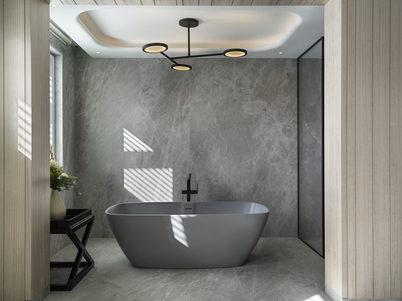 Τα άφθονα μαρμάρινα μπάνια διαχωρίζονται διακριτικά από τους κομψούς χώρους του καθιστικού, που καταλήγουν σε μεγάλα ανοίγματα. Σαν άλλα χέρια που απλώνονται για να εναγκαλιστούν τον ορίζοντα, οι γραφικές βεράντες, άψογα