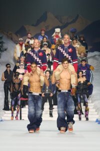 Στη menswear πλευρά, το ski και το hockey γίνονται πολιτισμικοί κώδικες. Jerseys, knit σύνολα εμπνευσμένα από après-ski αισθητική και flared δερμάτινα παντελόνια επαναπροσδιορίζουν το χειμερινό ανδρικό ντύσιμο με την ακατέργαστη ενέργεια που αποτελεί σήμα κατατεθέν της Dsquared2. Τίποτα δεν είναι διακριτικό· όλα είναι σχεδιασμένα για να ξεχωρίζουν, να προκαλούν και να κινούνται με αυτοπεποίθηση.