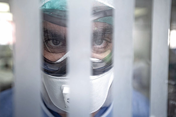 Έχουµε γεµίσει σηµάδια από τη µάσκα. Πλέον, αυτό είναι το αληθινό µας πρόσωπο. Καθηµερινά, ο ένας ελέγχει τον άλλον αν φοράµε σωστά τη στολή. Υπήρξαν φορές που χρειάστηκε να κάνουµε κάτι πιο επεµβατικό µε αποτέλεσµα να σκιστεί ένα γάντι ή να φύγει η µάσκα. Σε αυτή την περίπτωση, περίµενε έξω από το δωµάτιο άλλος συνάδελφος και έµπαινε µέσα για να βοηθήσει.