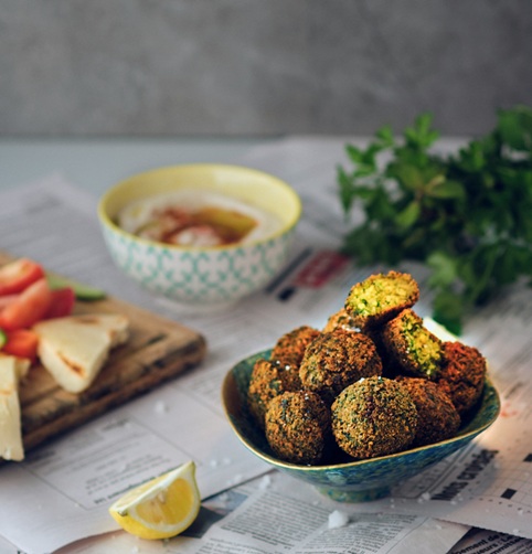 Όταν η βάση είναι έτοιμη, προσθέτουμε λίγο αλεύρι ώστε να δέσει η ζύμη και τη διαμορφώνουμε σε μικρές μπαλίτσες. Αντί για το κλασικό τηγάνισμα, τοποθετούμε τα φαλάφελ σε ταψί με λαδόκολλα και ελαφρύ βούτυρο ή ελαιόλαδο. Στους 200°C για περίπου 20-25 λεπτά θα αποκτήσουν χρυσαφένιο και ελαφρά τραγανό εξωτερικό — ιδανικό για ένα street-food ύφος με πιο υγιεινό προφίλ.