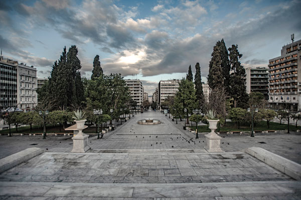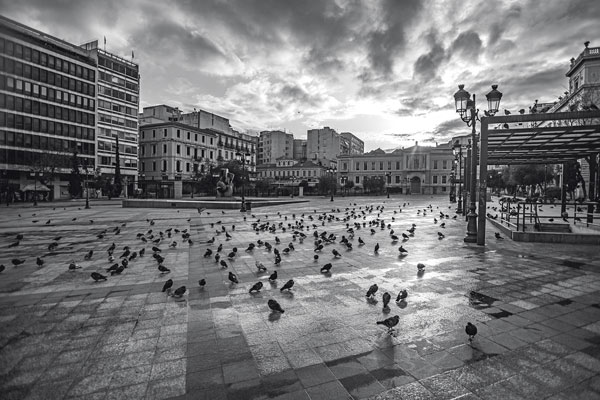 ΠΛΑΤΕΙΑ ΚΟΤΖΙΑ: Τα περιστέρια έχουν απλωθεί ανενόχλητα, ψάχνοντας ξεχασμένα ψίχουλα μπροστά από το Δημαρχιακό Μέγαρο Αθηνών και τα άλλα επιβλητικά νεοκλασικά.