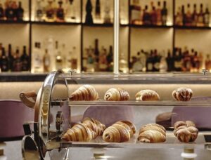 Ανάμεσα στις προτάσεις, ξεχωρίζει το νοσταλγικό «Ψωμί, Βούτυρο & Μέλι», φτιαγμένο αποκλειστικά με προϊόντα μικρών παραγωγών – μέλι από τα μελίσσια του ξενοδοχείου στην Κερκίνη, αιγοπρόβειο βούτυρο από τη Δεσκάτη Γρεβενών και ψωμί ζυμωμένο καθημερινά στο αρτοποιείο του King George. Οι μαρμελάδες χωρίς ζάχαρη, φτιαγμένες από φρούτα της Λάρισας, και το trolley viennoiserie με χειροποίητα κρουασάν που σερβίρονται ζεστά, συμπληρώνουν την εμπειρία με μια αίσθηση οικειότητας και πολυτέλειας.