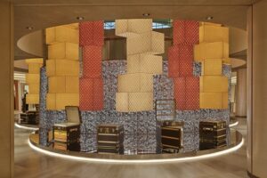 Η εμπειρία ξεκινά στο Trunkscape, ένα εντυπωσιακό πέρασμα επενδεδυμένο με εμβληματικά Boîte Chapeau, όπου συστήνεται η φιλοσοφία του Οίκου γύρω από την τέχνη του ταξιδιού. Ένας LED φωτεινός ελικοειδής διάδρομος οδηγεί στη συνέχεια ψηλότερα, δημιουργώντας μια ζωντανή γραμμή χρόνου αφιερωμένη στην παράδοση του savoir-faire.