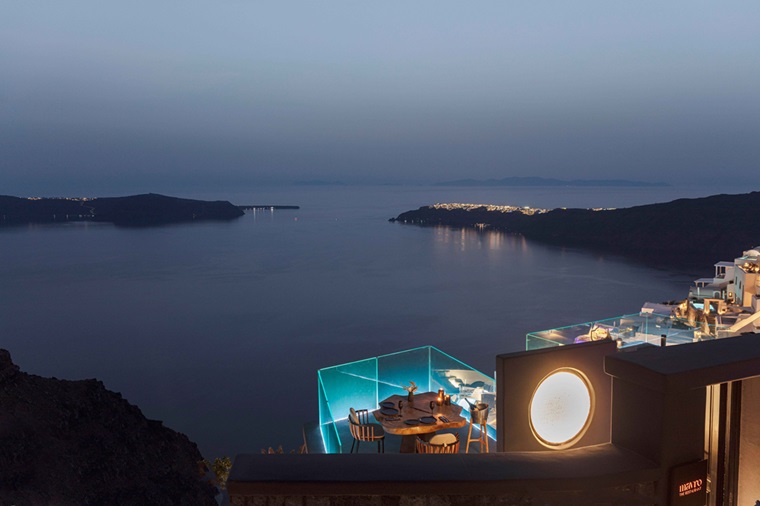 Ο σχεδιασμός του Kivotos Santorini με σαγηνευτικές «ρωγμές» σε εσωτερικούς τοίχους και οροφές, διακριτικά φωτισμένες σε ένα φάσμα εναλλασσόμενων χρωμάτων για να δημιουργούν αιθέρια ατμόσφαιρα, με ιδιωτικές πισίνες και υδρομασάζ να ξεπροβάλλουν μέσα από τον βράχο, συνθέτουν ένα μοναδικό σκηνικό σε διεθνές επίπεδο.