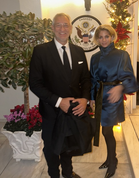 Η κατοικία της Πρέσβη ήταν διακοσμημένη με υψηλή αισθητική και έντονο χριστουγεννιάτικο χαρακτήρα, δημιουργώντας το ιδανικό σκηνικό για μια βραδιά κοινωνικής και διπλωματικής δικτύωσης, με φόντο τη γιορτινή ατμόσφαιρα των ημερών.