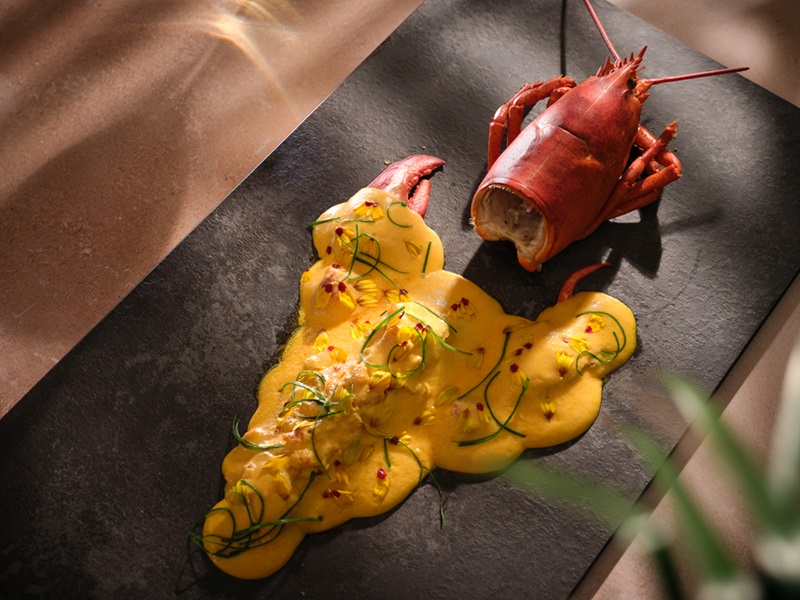 - Blue Lobster: Αστακός με σάλτσα hollandaise rocoto, τσιπς από κασάβα, φρέσκο κρεμμύδι, βρώσιμα λουλούδια