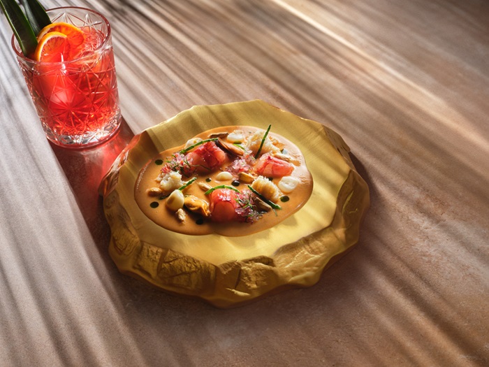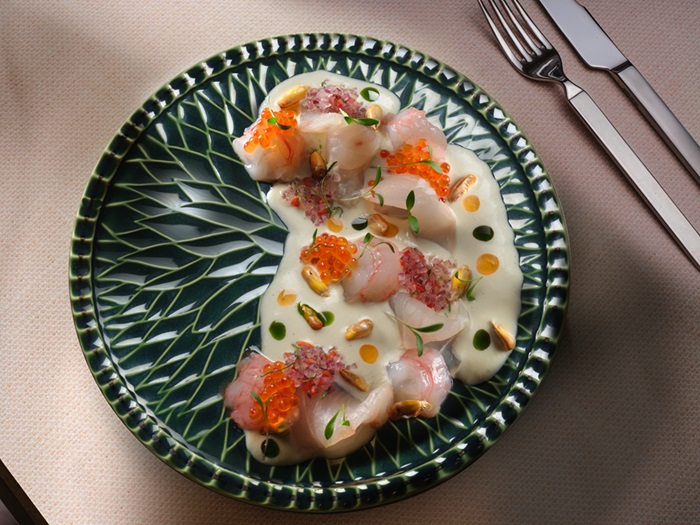 - Langoustines Cebiche: Καραβίδες, ψάρι ημέρας, καλαμπόκι cancha, γλυκοπατάτα, λάδι κόλιανδρου, αυγά πέστροφας, ajo blanco leche de tigre