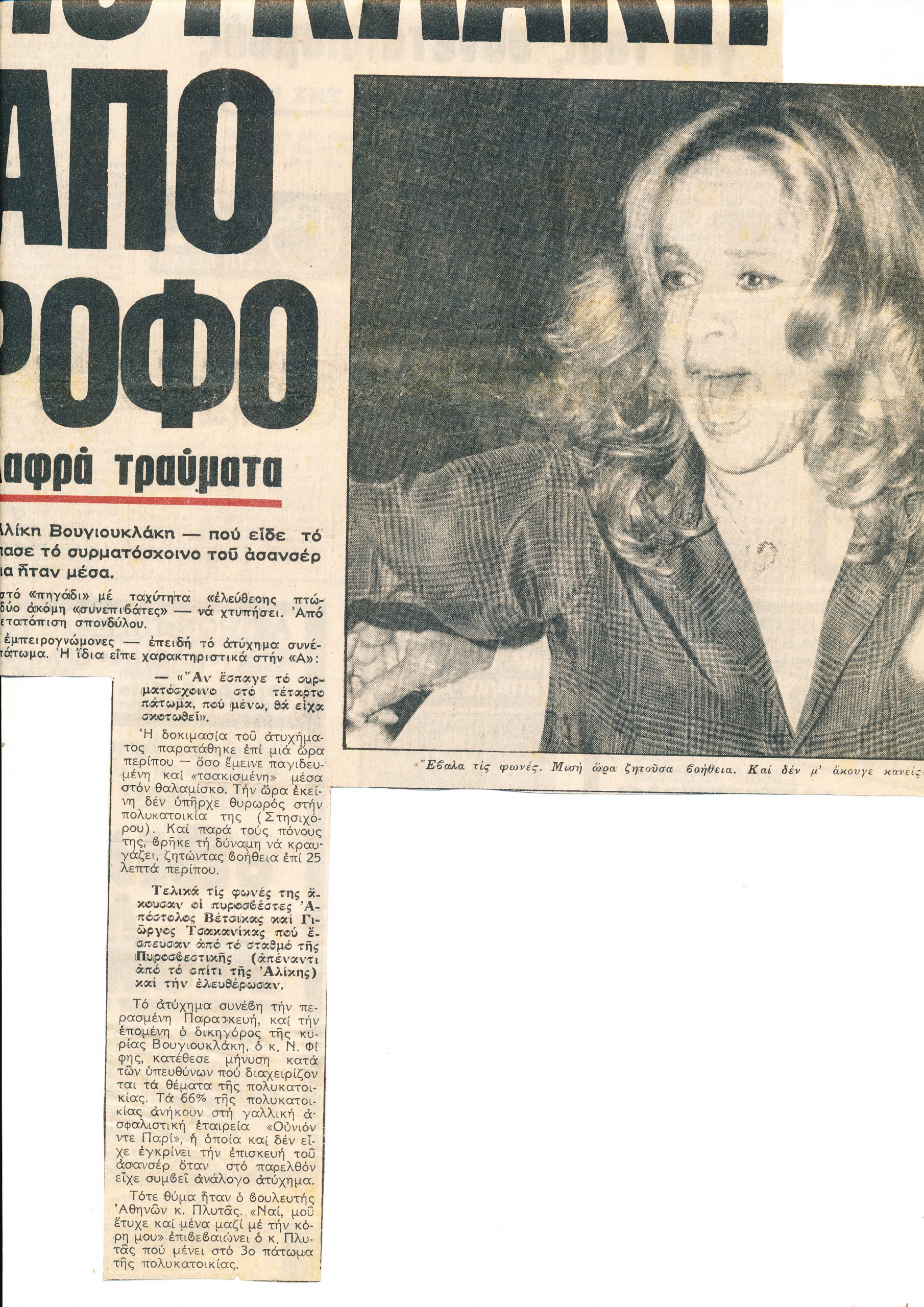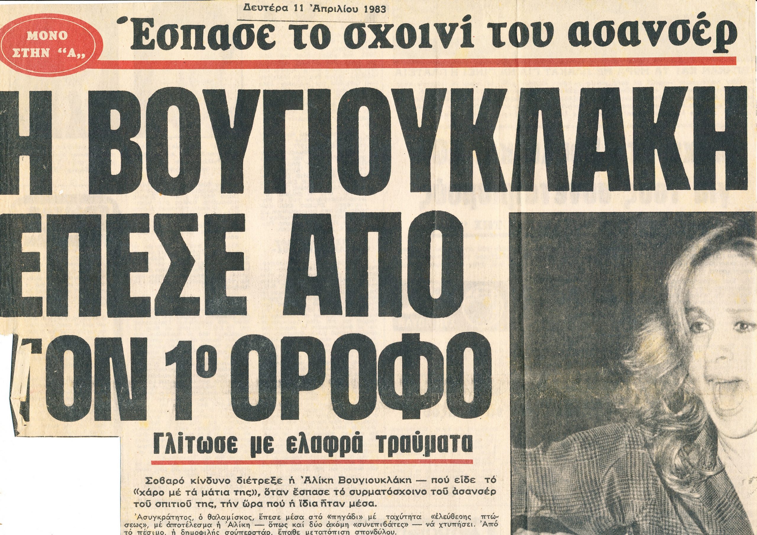 «Σοβαρό κίνδυνο διέτρεξε η Αλίκη Βουγιουκλάκη, που είδε τον χάρο με τα μάτια της, όταν έσπασε το συρματόσκοινο του ασανσέρ του σπιτιού της, την ώρα που ήταν η ίδια μέσα. Ασυγκράτητος ο θάλαμος έπεσε μέσα στο “πηγάδι” με ταχύτητα ελεύθερης πτώσης. Αποτέλεσμα, η Αλίκη, όπως ακόμα και δυο συνεπιβάτες, να χτυπήσει. Από το πέσιμο η δημοφιλής σούπερ σταρ έπαθε μετατόπιση σπονδύλου», εξηγούσε το άρθρο, συνεχίζοντας: «Η Αλίκη γλίτωσε, όπως έλεγαν τεχνικοί εμπειρογνώμονες, επειδή το ατύχημα συνέβη όταν ο θάλαμος βρισκόταν στον πρώτο όροφο. Η ίδια είχε δηλώσει χαρακτηριστικά: “Αν έσπαγε το συρματόσκοινο στο τέταρτο πάτωμα όπου μένω, θα είχα σκοτωθεί”. Η δοκιμασία του ατυχήματος παρατάθηκε επί μια ώρα περίπου, όσο η Αλίκη έμεινε τσακισμένη και παγιδευμένη μέσα στον θαλαμίσκο. Εκείνη την ώρα δεν υπήρχε θυρωρός στην πολυκατοικία της Στησιχόρου. Και παρά τους φρικτούς της πόνους, βρήκε τη δύναμη να κραυγάζει, ζητώντας βοήθεια για 25 λεπτά περίπου. Τελικά τις φωνές της άκουσαν οι πυροσβέστες Απόστολος Βέτσικας και Γιώργος Τσακανίκας που έσπευσαν από τον σταθμό πυροσβεστικής (απέναντι από το σπίτι της Αλίκης) και την ελευθέρωσαν. Το ατύχημα συνέβη την περασμένη Παρασκευή και την επομένη ο δικηγόρος της Βουγιουκλάκη, ο κύριος Ν. Φίφης, κατέθεσε μήνυση κατά των υπευθύνων που διαχειρίζονται τα θέματα της πολυκατοικίας. Στο παρελθόν είχε συμβεί ανάλογο ατύχημα στο ίδιο ασανσέρ. Τότε θύμα ήταν ο βουλευτής Αθηνών κύριος Πλυτάς».