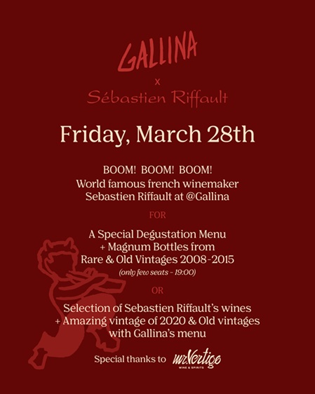 Την Παρασκευή 28 Μαρτίου, το Gallina φιλοξενεί έναν από τους πιο ξεχωριστούς οινοπαραγωγούς του Sancerre, τον SebastienRiffault. Γνωστός για την αντισυμβατική του προσέγγιση στην παραγωγή, ο Riffault έχει κατακτήσει τις καρδιές των οινόφιλων παγκοσμίως με τα φυσικά, ακατέργαστα και γεμάτα χαρακτήρα Sancerre του.