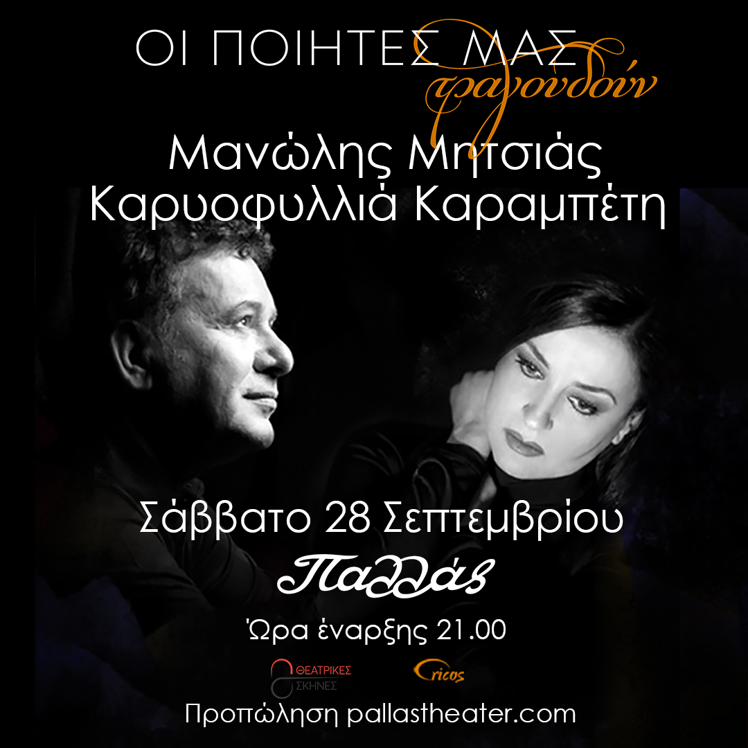 Μετά τις επιτυχημένεςsoldout συναυλίες του χειμώνα, ο Μανώλης Μητσιάς και η Καρυοφυλλιά Καραμπέτη περιδιαβαίνουν ξανά τον μαγικό κόσμο της ελληνικής ποίησης παρουσιάζονταςστο Παλλάς, το Σάββατο28 Σεπτεμβρίου 2024, ένα ανανεωμένο πρόγραμμα που περιλαμβάνει έργα σπουδαίων Ελλήνων ποιητών και στιχουργών, πουέχουν μελοποιήσει οι συνθέτες Μίκης Θεοδωράκης, Μάνος Χατζιδάκις, Σταύρος Ξαρχάκος, Δήμος Μούτσης, Ηλίας Ανδριόπουλος, Θάνος Μικρούτσικος, Χρήστος Λεοντής, και Γιάννης Σπανός. Ακούγονται μελοποιημένοι: Κωνσταντίνος Καβάφης, Κώστας Βάρναλης, Γιώργος Σεφέρης, Οδυσσέας Ελύτης, Γιάννης Ρίτσος, Τάσος Λειβαδίτης, Μανόλης Αναγνωστάκης, Νίκος Καββαδίας, Νίκος Γκάτσος, κ.ά.