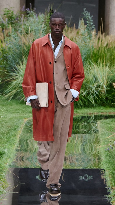 Εκτός από τα τρίκουμπακοστούμια, η ανδρική ένδυση περιλάμβανε πιο casual σιλουέτες, όπως πουκάμισα με μία τσέπη, κρυφή πατιλέτακαι στρίφωμα με κορδόνι, συνδυασμένα με παντελόνια με μήκος λίγο κάτω από το γόνατο.Τα βραδινά σύνολα αποτελούνταν από tailored παλτό, μεταξωτά σακάκια με στρογγυλό πέτο και piping φινίρισμα. Για τις τελευταίες πινελιές, εκτός από τις πασμίνες και τα καπέλα, στα ανδρικά αξεσουάρ παρατηρήθηκε η αφαίρεση των παραδοσιακώνκατασκευών, όπως φαίνεται με τη μορφή μαλακώνχαρτοφυλάκωνκαι τσαντών εμπνευσμένων από τον αθλητισμό.