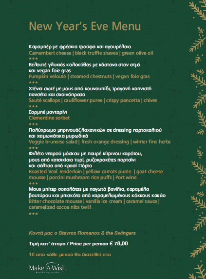 Για τις δύο ωραιότερες νύχτες του χρόνου το ειδυλλιακό spot στα νότια έχει ετοιμάσει δύο υπέροχα γιορτινά μενού με άψογα πιάτα για να υποδεχτούμε τα Χριστούγεννα και την Πρωτοχρονιά με τον πιο γευστικό τρόπο. Κι ενώ θα τρώμε, θα πίνουμε και θα απολαμβάνουμε το καλόγουστο περιβάλλον και τη θέα στη θάλασσα, θα λικνιζόμαστε και στους ρυθμούς της jazz. Ο Σταύρος Ρωμανός και οι Swingers μας έχουν ετοιμάσει ένα πλούσιο μουσικό πρόγραμμα που θα απογειώσει την party διάθεση.