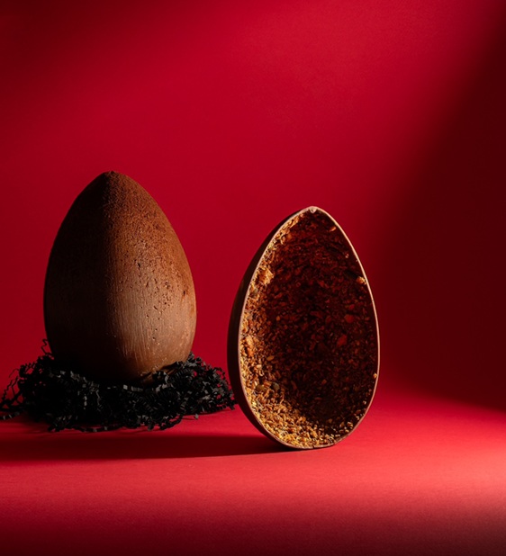 Αφυδατωμένα flakes από ζύμη κρουασάν, προηγουμένως εμποτισμένα σε αρωματικό σιρόπι, προσφέρουν τραγανή υφή σε σοκολάτα γάλακτος 33,6% κακάο. Η σοκολάτα χαρακτηρίζεται από έντονο άρωμα καβουρδισμένου κακάο και απαλές νότες καραμέλας, παρασκευασμένη από εκλεκτούς κόκκους Δυτικής Αφρικής. - Σοκολατένιο αυγό με bitter σοκολάτα και καραμελωμένα crumbsπροζυμένιου ψωμιού
