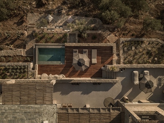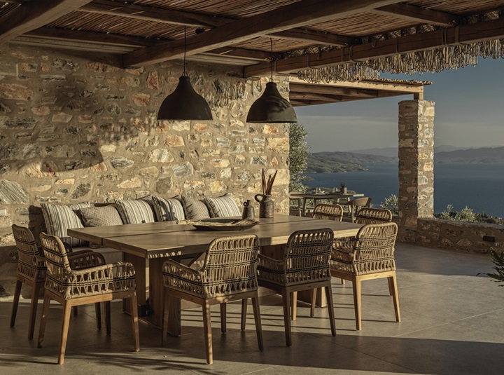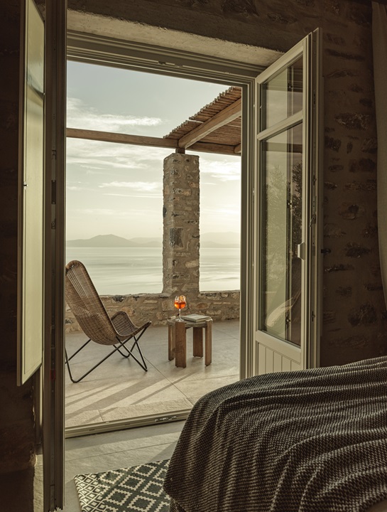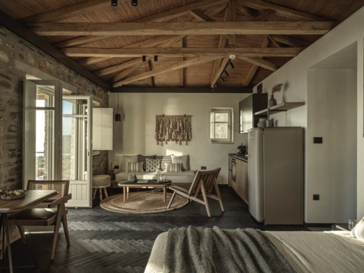 Στις σουίτες η αισθητική σέβεται το τοπίο και οι απαλοί γήινοι τόνοι συνδυάζονται με λιτές γραμμές που αναδεικνύουν τη φυσική ομορφιά. Οι μεγάλες ανοιχτές βεράντες, οι πέργκολες από καστανιά και λυγαριά, τα φυτά και τα ελαιόδεντρα μεταφέρουν την αίσθηση της γης με μια αύρα ηρεμίας και χαλάρωσης. Ο αρχιτεκτονικός σχεδιασμός και το interior design φέρουν την υπογραφή του G2lab δημιουργώντας μια bohemian chic ατμόσφαιρα.