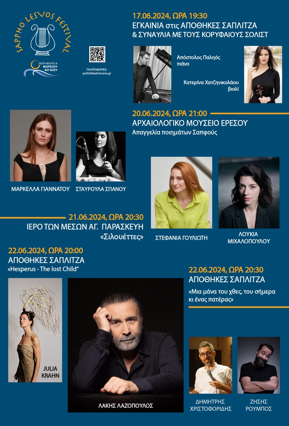 Φέτος για πρώτη φορά εγκαινιάζεταιμια νέα πολιτιστική δράση της Περιφέρειας Βορείου Αιγαίου, το SAPPHO LESVOS FESTIVAL στην γενέτειρα της «δέκατης μούσας», της Σαπφώς, στη Λέσβο.