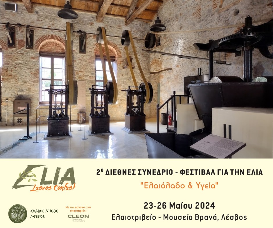 Ο Πολιτιστικός Σύλλογος “Ελαίας Νήσος Λέσβος” διοργανώνει το 2ο Elia Lesvos Confest “Ελαιόλαδο και Υγεία” από 23 έως 26 Μαΐου 2024, στο εμβληματικό Ελαιοτριβείο – Μουσείο Βρανά στον Παππάδο Γέρας, ένα από τα παλαιότερα ελαιοτριβεία της Λέσβου, το οποίο ανήκε στην οικογένεια του νομπελίστα ποιητή Οδυσσέα Ελύτη.
