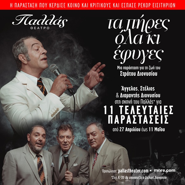 «Τα πήρες όλα κι έφυγες – Η ζωή του Στράτου Διονυσίου»: Η παράσταση που κέρδισε κοινό και κριτικούς, συνεχίζει την θεατρική διαδρομή της για λίγες ακόμα παραστάσεις. Το κοινό υποδέχτηκε με ενθουσιασμό την θεατρική απόδοση της μυθιστορηματικής ζωής του Στράτου Διονυσίου και δίνει το πιο ζεστό του χειροκρότημα κάθε βράδυ στο κατάμεστο Θέατρο Παλλάς.Λόγω μεγάλης προσέλευσης, το Θέατρο Παλλάς ανακοινώνει 11 επιπλέον παραστάσεις στην Αθήνα,έως και τις 11 Μαΐου.