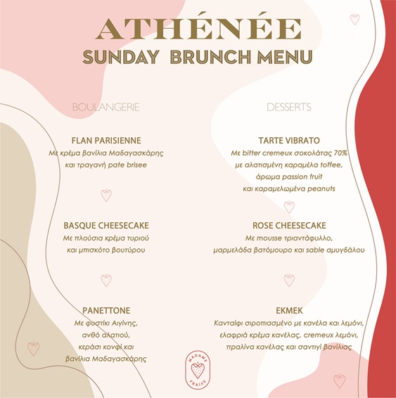 H ταλαντούχα ομάδα της Noble Pastry Athens με την υπογραφή των Executive Pastry Chef Ευγένιου Βαρδακαστάνη και Γιάννη Κίκιρα, έρχεται στο Athénée με τις εκλεπτυσμένες γεύσεις της, στο καθιερωμένο Sunday brunch που έχει γίνει η αγαπημένη συνήθεια του πιο hype κοινού της πόλης.