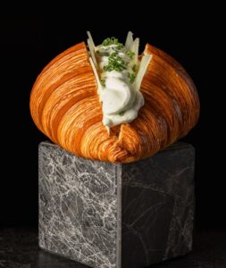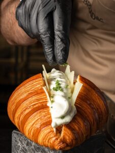 Η προβατίνα σιγομαγειρεύεται για 16 ώρες με τη μέθοδο sous vide, διατηρώντας τη ζουμερή υφή και τη βαθιά γεύση της. Στη συνέχεια, ολοκληρώνεται σε πλούσια σάλτσα και «αγκαλιάζεται» από ένα αφράτο, βουτυρένιο κρουασάν. Η μαρμελάδα ντομάτας, η γραβιέρα Κρήτης και το γιαούρτι με μυρωδικά έρχονται να ισορροπήσουν την ένταση, δημιουργώντας μια γευστική εμπειρία τολμηρή αλλά απόλυτα αρμονική.