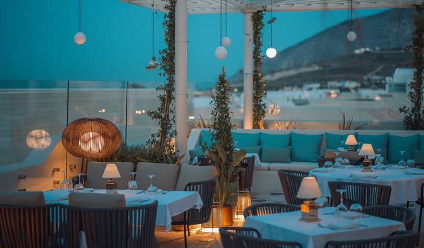 Από την ήσυχη – σχεδόν privé – βεράντα του Elio’s η θέα στην πισίνα του ξενοδοχείου και τη θάλασσα είναι εξαιρετική. Στους εσωτερικούς χώρους κυριαρχούν τα φυσικά υλικά όπως το ξύλο και το μάρμαρο σε αποχρώσεις που φέρνουν στο νου τις διάσημες παραλίες της Σαντορίνης, την Κόκκινη, την Μαύρη και την Άσπρη παραλία. Σε συνδυασμό με τα φυτά που βρίσκονται παντού, δημιουργούν μια σαγηνευτική ατμόσφαιρα, νοσταλγική και σύγχρονη ταυτόχρονα.