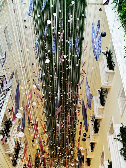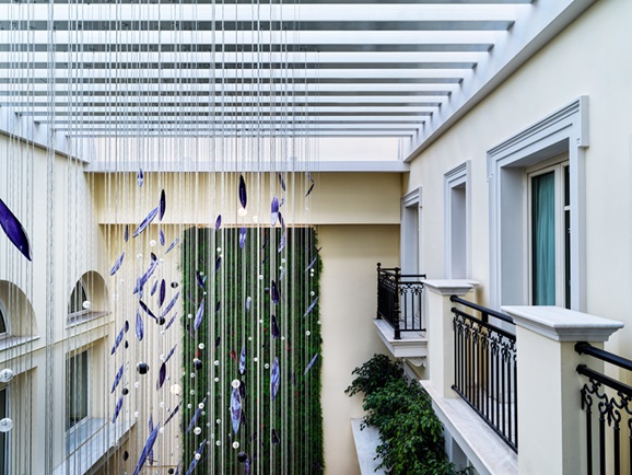 Συγκεκριμένα, στο εσωτερικό αίθριο του King George αποκαλύπτεται μια εξαιρετική custom-made γυάλινη εγκατάσταση μήκους 21 μέτρων πουαιχμαλωτίζει τις αισθήσεις. Το έργο είναι εμπνευσμένο από το ελαιόδεντρο και τη διαχρονική του γοητεία, που αποτελεί σύμβολο της χώρας μας. Πρωταρχικός σκοπός αυτής της καλλιτεχνικής προσθήκης ήταν να εμπλουτίσει τη φωτεινή, ωστόσο απρόσκλητη, εσωτερική όψη του ξενοδοχείου με ένα ελκυστικό θέαμα.