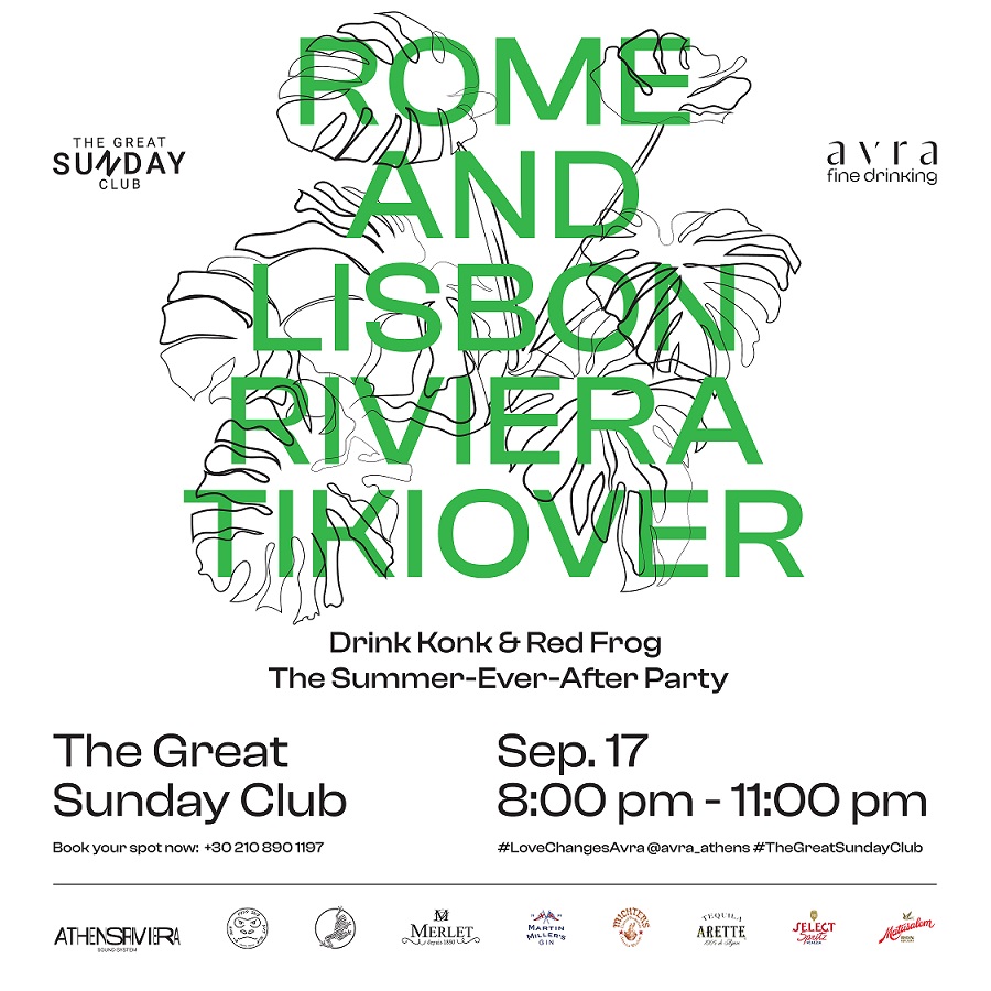 Είστε αποφασισμένοι να εξαντλήσετε κάθε στιγμή ηλιοφάνειας και διασκέδασης αυτό το καλοκαίρι; Το Avra το διάσημο bar-destination στο Four Seasons Astir Palace Hotel Athens–θα φιλοξενήσει ένα Summer-Ever-After Party στο Great Sunday Club του, την Κυριακή 17 Σεπτεμβρίου, από τις 20:00. Σε αυτό το ξεχωριστό πάρτι, που αποτελεί μια ωδή στο καλοκαίρι στην Αθηναϊκή Ριβιέρα, θα παρευρεθούν δύο guest bartenders, ο Patrick Pistolesi και ο Emanuel Minez, από τα βραβευμένα bar Drink Kong στη Ρώμη και Red Frog στη Λισαβόνα.