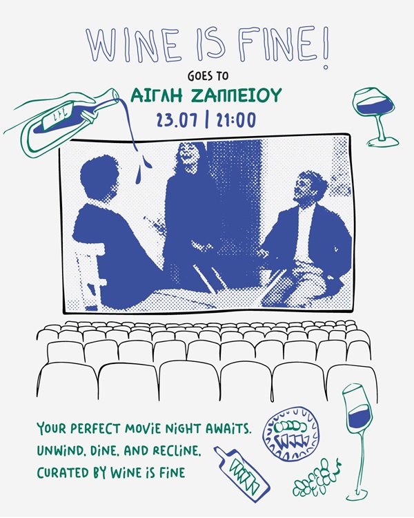 Το Wine is Fine, το πιο hip, «wine bar της πόλης, συναντά την εμβληματική Αίγλη Ζαππείου για μια βραδιά-εμπειρία την Τρίτη, 23 Ιουλίου, στις 21:00 όπου η μαγεία της γαστρονομίας συναντά την γοητεία του θερινού κινηματογράφου.