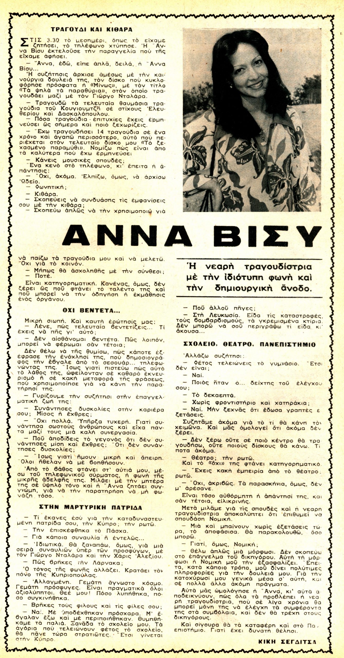 Δεν είχε ακόμα ξεκινήσει μουσικές σπουδές, ήθελε να πάει στο ωδείο και να μάθει κιθάρα. Είχε όμως ήδη δημιουργήσει μύθο γύρω από το όνομά της και το αποδεικνύει η ερώτηση της δημοσιογράφου: «Λένε πως τελευταία βεντετίζεις». Η απάντηση της Άννας ήταν: «Δεν το παίζω βεντέτα. Πώς λοιπόν μπορώ να φέρομαι σαν τέτοια;».